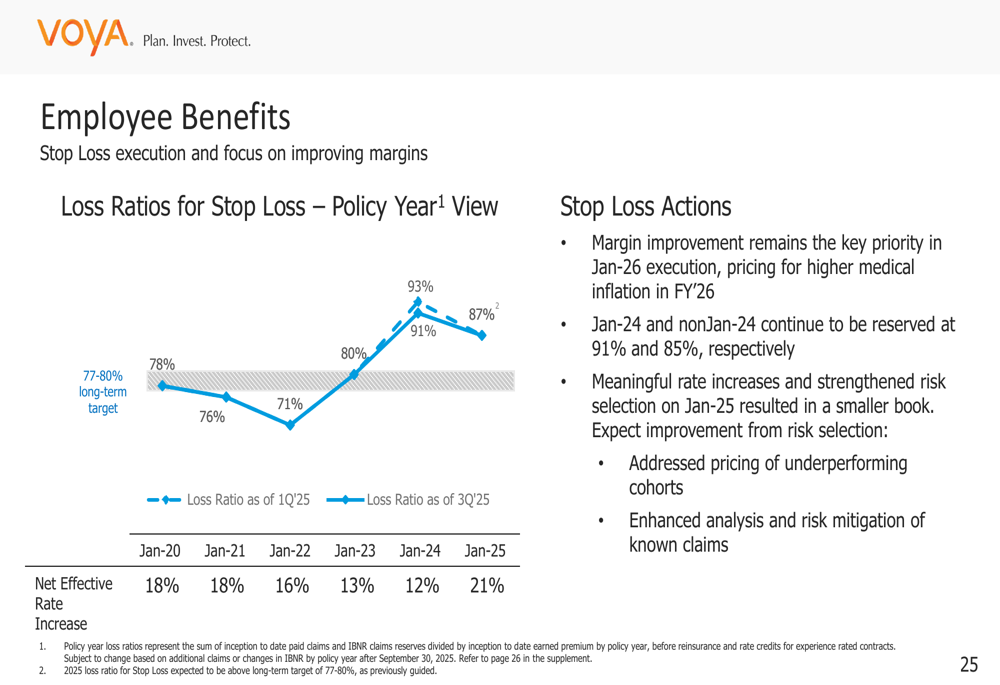 Voya maintained all reserve levels in Stop Loss, with January 2025 paid claims experience expected to be two-thirds complete in Q4 2025. The company noted that reinsurance recoverable provided favorability in the net loss ratio for Stop Loss in Q3 2025.