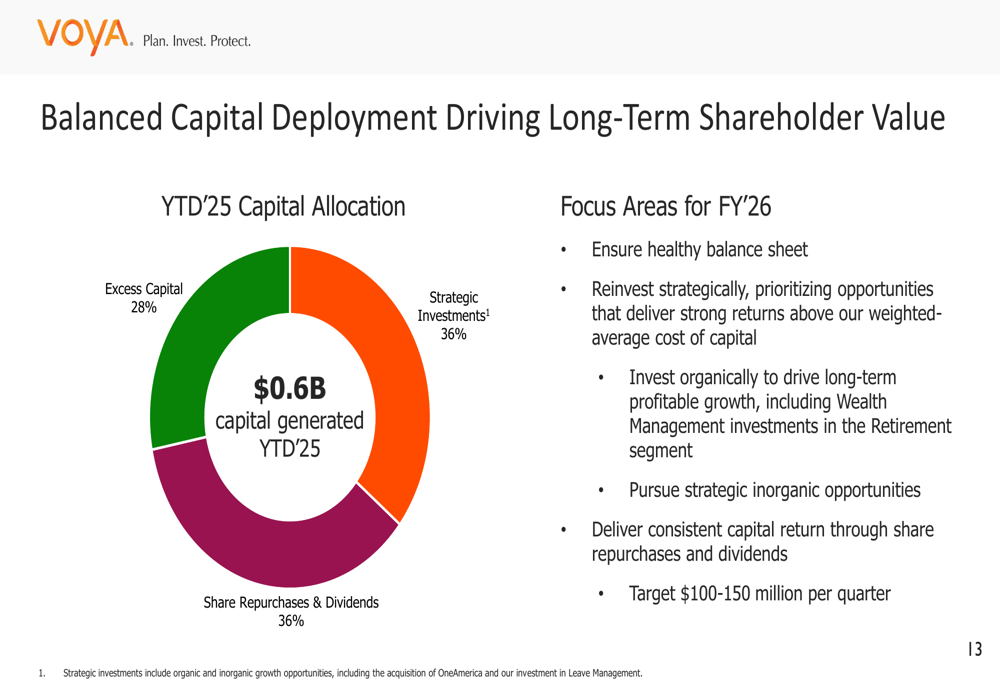Year-to-date capital allocation has been evenly distributed, with 36% directed to share repurchases and dividends, 36% to strategic investments, and 28% to excess capital. For 2026, Voya plans to continue this balanced approach while targeting $100-150 million per quarter in capital returns through share repurchases and dividends.