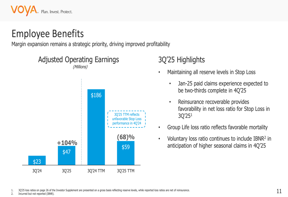 The Employee Benefits segment showed significant improvement, with adjusted operating earnings more than doubling to $47 million in Q3 2025 from $23 million in Q3 2024. The improvement was largely due to better performance in the Stop Loss business.