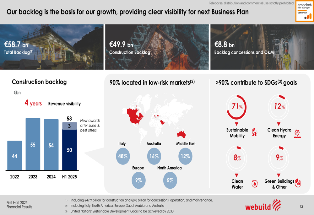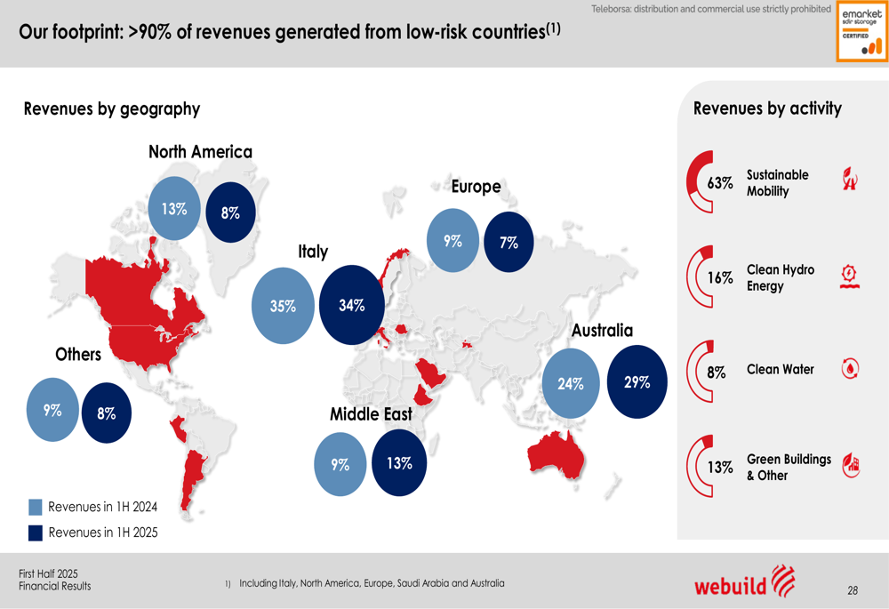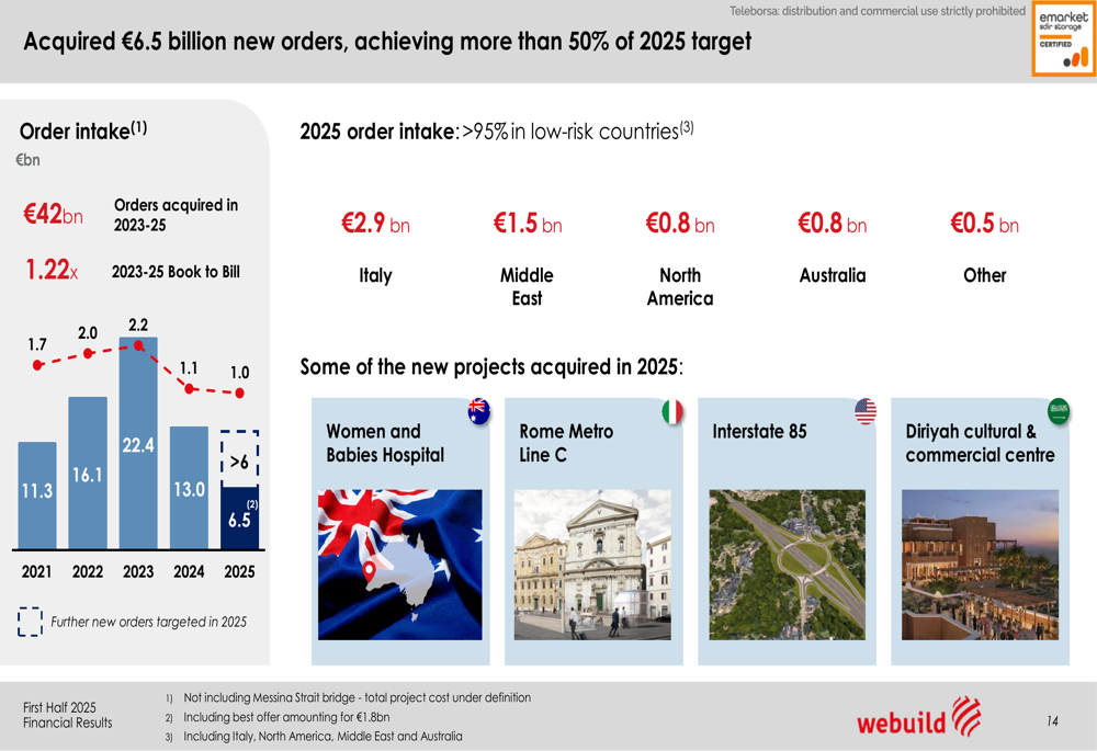 In the first half of 2025, Webuild secured €6.5 billion in new orders, achieving more than 50% of its full-year target. These new orders are predominantly (>95%) in low-risk countries, with significant contributions from Italy (€2.9 billion), the Middle East (€1.5 billion), North America (€0.8 billion), and Australia (€0.8 billion).