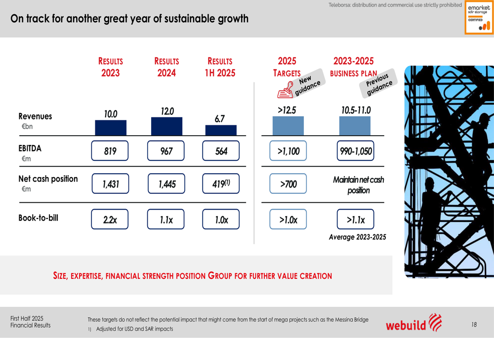 Webuild has confirmed its 2025 guidance, targeting revenues exceeding €12.5 billion, EBITDA of over €1.1 billion, a net cash position above €700 million, and a book-to-bill ratio greater than 1.0x. These targets represent significant improvements over the original 2023-2025 Business Plan projections.