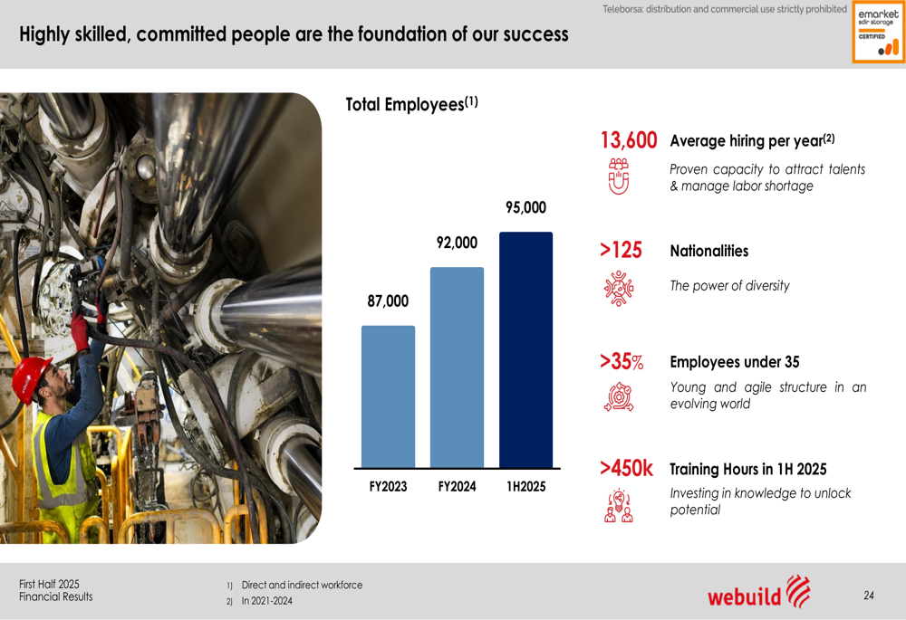 Supporting Webuild’s growth is a committed workforce of 95,000 employees representing over 125 nationalities. The company has a focus on young talent, with more than 35% of employees under 35 years old, and invested in over 450,000 training hours in the first half of 2025.