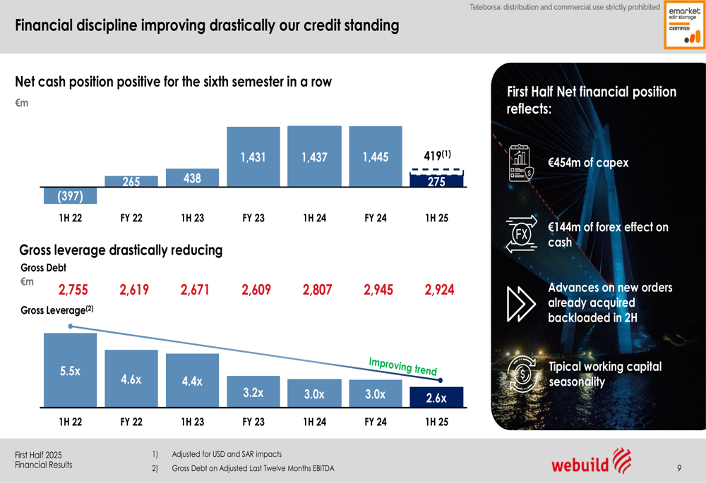 Webuild has maintained a net cash position for the sixth consecutive semester, ending the period at €275 million (€419 million at constant exchange rate). The company’s financial discipline is evident in its reduced gross leverage, which improved to 2.6x from 3.0x at the end of 2024.