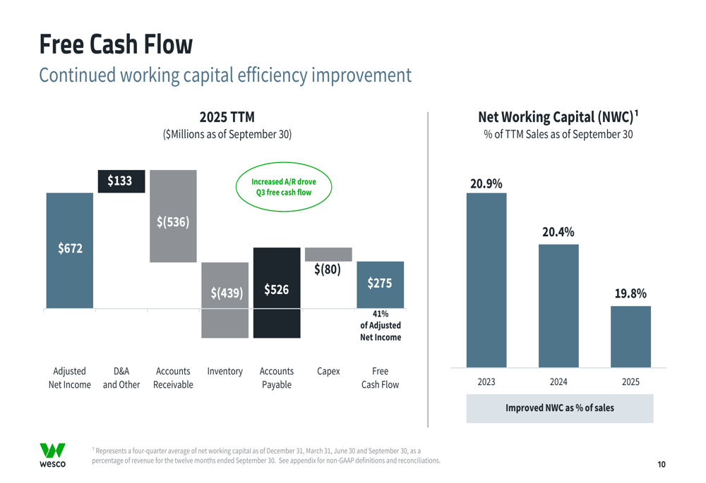 WESCO’s free cash flow on a trailing twelve-month basis was $275 million, with increased accounts receivable driving the Q3 free cash flow dynamics. The company has improved its working capital efficiency, with Net Working Capital as a percentage of TTM Sales decreasing from 20.9% in 2023 to 19.8% in 2025.