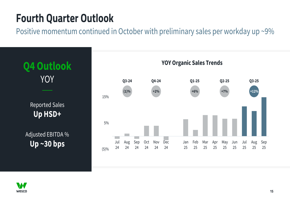 Looking ahead to the fourth quarter, WESCO noted that positive momentum continued into October, with preliminary sales per workday up approximately 9%. The company’s organic sales growth has been accelerating throughout 2025, as shown in this trend chart: