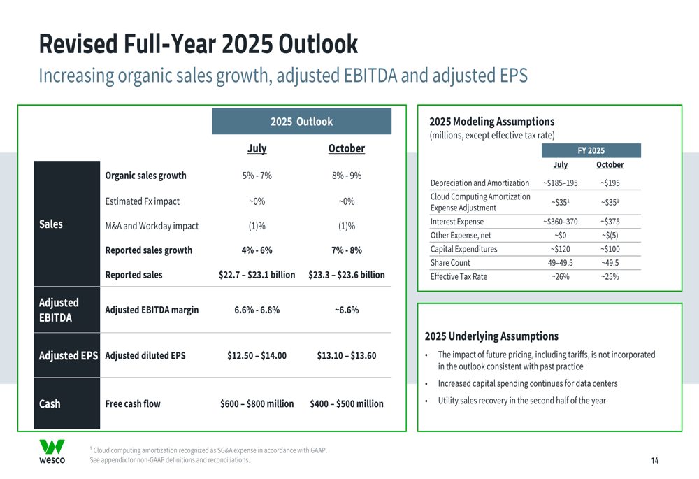 Based on the strong third-quarter performance and continued positive momentum, WESCO has raised its full-year 2025 outlook. The company now expects organic sales growth of 8-9% (up from 5-7% previously) and reported sales growth of 7-8% (up from 4-6%).