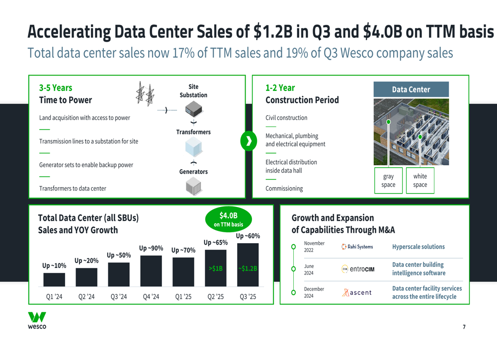 A standout element of WESCO’s third quarter performance was the exceptional growth in its data center business. Data center sales reached approximately $1.2 billion in Q3, representing a 60% increase year-over-year and now accounting for 19% of quarterly sales.