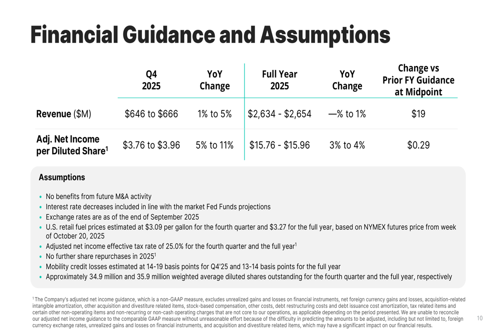 Based on its strong third-quarter performance, WEX raised its full-year 2025 guidance for both revenue and adjusted net income. For the fourth quarter, the company expects revenue between $646 million and $666 million, representing year-over-year growth of 1% to 5%. Adjusted net income per diluted share is projected to be between $3.76 and $3.96, a 5% to 11% increase from the previous year.