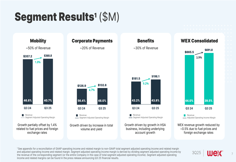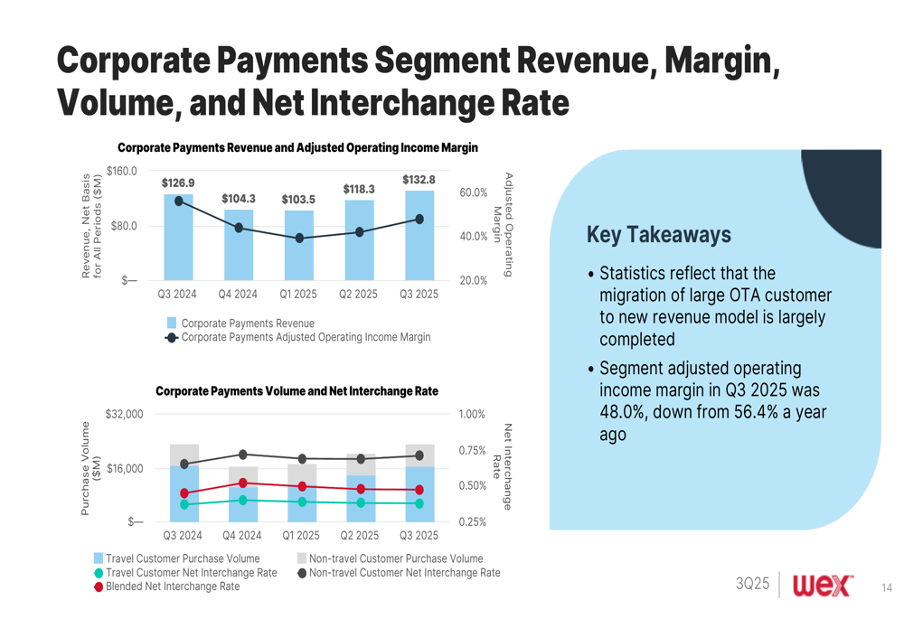 The Corporate Payments segment, which represents approximately 20% of WEX’s revenue, experienced changes in its business model. The company noted that the migration of a large online travel agency (OTA) customer to a new revenue model is largely completed. However, this transition appears to have affected margins, as the segment adjusted operating income margin decreased from 56.4% in Q3 2024 to 48.0% in Q3 2025.