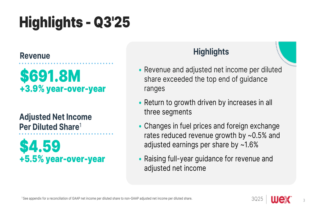 WEX delivered solid financial results in the third quarter, with both revenue and adjusted net income surpassing guidance. The company highlighted that growth was driven by all segments, though partially offset by fluctuations in fuel prices and foreign exchange rates.