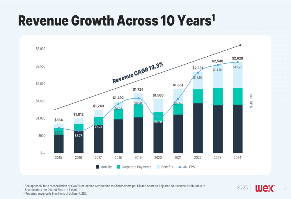WEX’s long-term growth trajectory remains positive, as evidenced by its 10-year revenue CAGR of 13.3%. The company has consistently grown its revenue from $854 million in 2015 to $2,628 million in 2024, demonstrating its ability to expand its business over time.