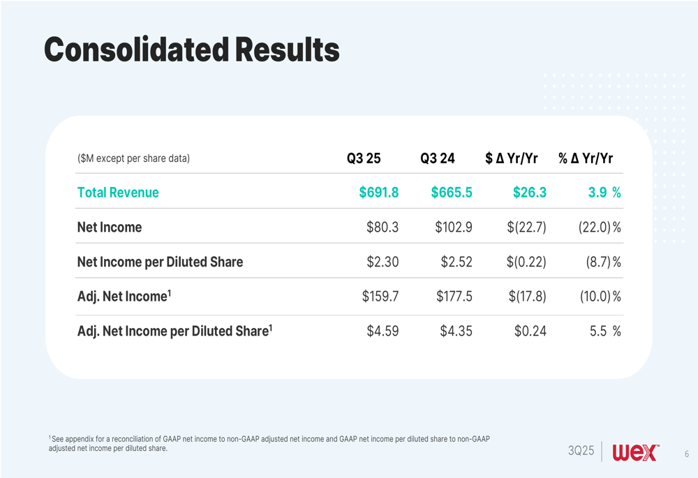 The consolidated financial results provide a more detailed view of WEX’s performance. While total revenue and adjusted net income per diluted share showed positive growth, net income decreased by 22.0% year-over-year to $80.3 million. This decline was primarily due to non-operational factors, as the company’s core business segments continued to perform well.