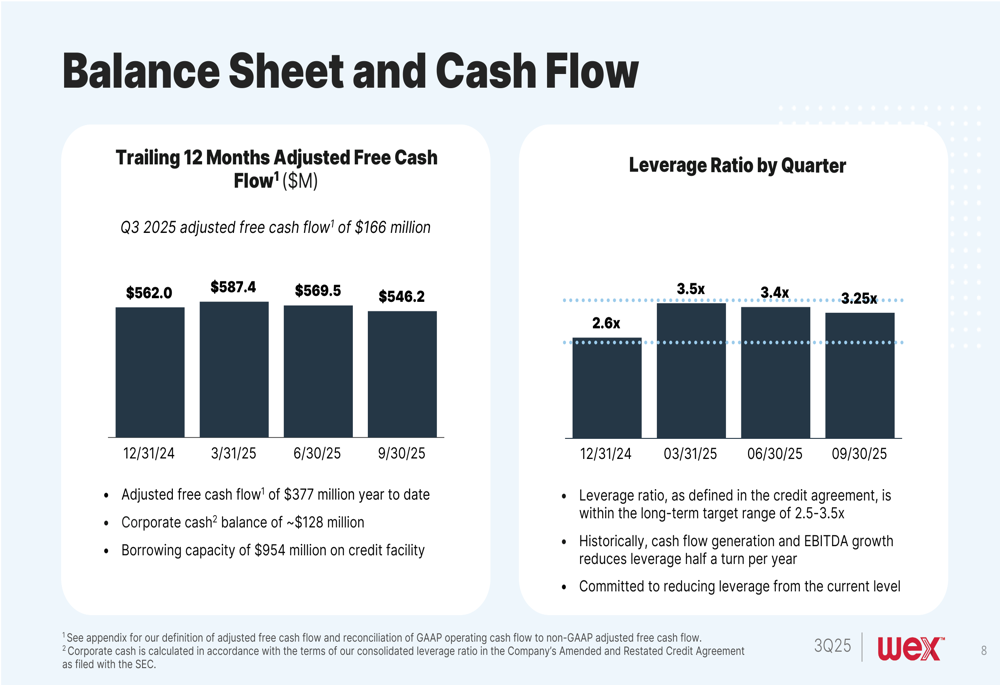 WEX maintained a strong financial position with a corporate cash balance of approximately $128 million and borrowing capacity of $954 million on its credit facility. The company’s leverage ratio stood at 3.25x, within its long-term target range of 2.5-3.5x.