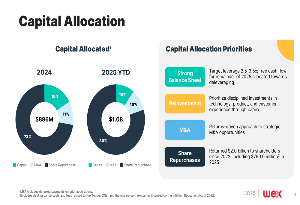 Capital allocation remains a key focus for WEX, with the company directing significant resources toward share repurchases. In 2025 year-to-date, WEX allocated 80% of its capital to share repurchases, 10% to M&A activities, and 10% to capital expenditures. The company has returned $790 million to shareholders in 2025 and $2.0 billion since 2022.