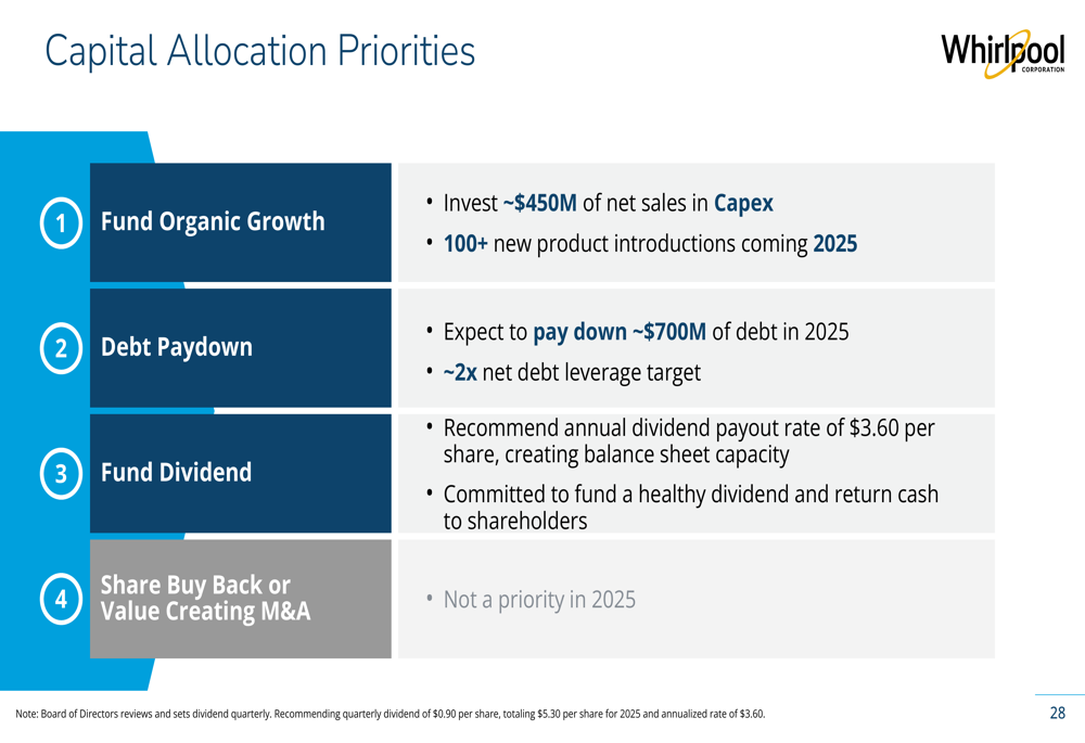 For capital allocation, Whirlpool outlined four priorities: funding organic growth with approximately $450 million in capital expenditures, paying down around $700 million in debt, maintaining a dividend payout of $3.60 per share, and deferring share buybacks or M&A activities for the year: