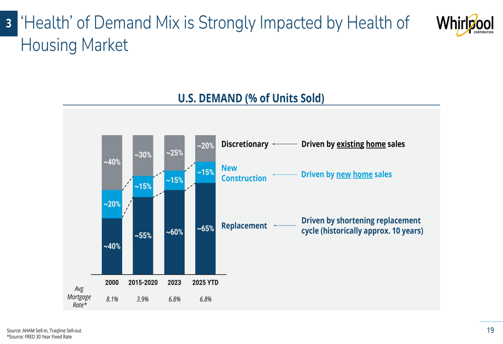 The company also highlighted the relationship between housing market health and appliance demand, noting that existing home sales have decreased substantially over the past three years, affecting discretionary demand which represents approximately 20% of total industry demand: