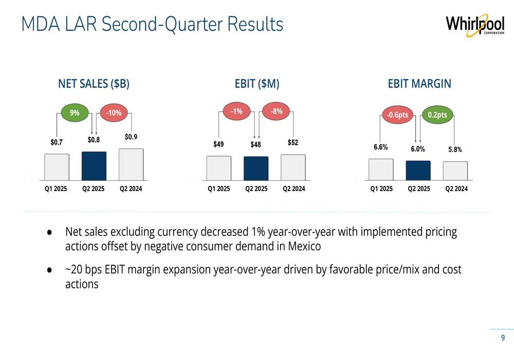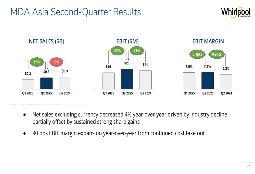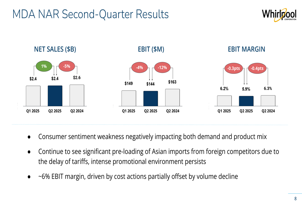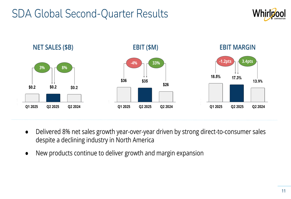 Despite challenging market conditions and a sales decline, Whirlpool demonstrated operational resilience in Q2 2025 by maintaining stable EBIT margins through cost management initiatives. The company’s SDA Global and Asia segments showed particular strength, helping to offset headwinds in North America.