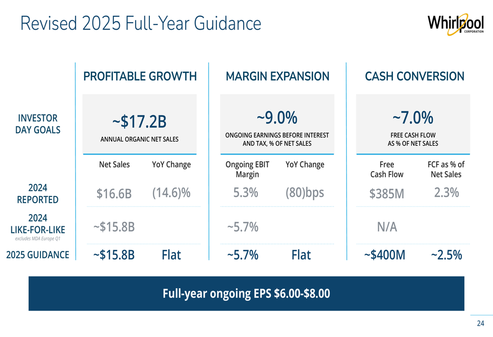 Whirlpool revised its 2025 full-year guidance, projecting net sales of approximately $15.8 billion, ongoing EBIT margin of around 5.7%, and free cash flow as a percentage of net sales at approximately 2.5%. The company set its full-year ongoing EPS guidance at $6.00-$8.00:
