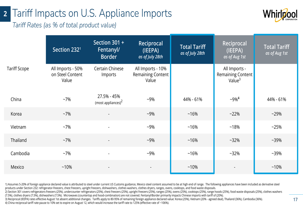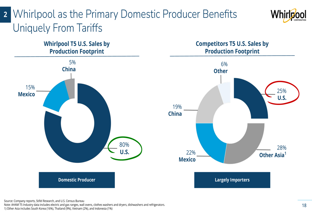 The company emphasized its unique position to benefit from U.S. tariffs on appliance imports, highlighting that 80% of its North American sales come from domestically produced products, compared to competitors who rely heavily on imports from China, Mexico, and other Asian countries: