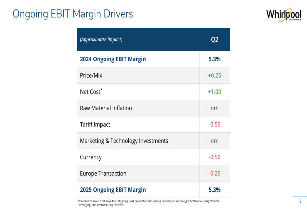 Breaking down the factors affecting EBIT margin, Whirlpool demonstrated that cost reduction initiatives (+1.00 point impact) helped offset negative pressures from tariffs (-0.50), currency (-0.50), and the Europe transaction (-0.25), resulting in a flat year-over-year margin:
