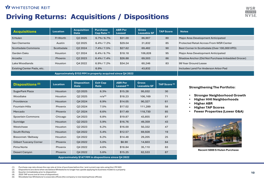 Since Q4 2022, Whitestone has acquired approximately $153 million in properties while disposing of about $147 million, effectively upgrading its portfolio quality. Recent acquisitions include properties in Fort Worth, Austin, Scottsdale, Houston, and Phoenix, with cap rates ranging from 6.4% to 7.4%.