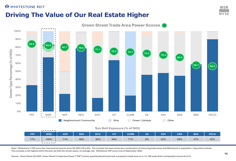 Whitestone also ranks second among peers in Green Street's Trade Area Power Scores with a score of 83.0, just behind Federal Realty Investment Trust (NYSE:FRT) at 84.0. The company stands out with 100% of its portfolio located in Sun Belt markets (Texas and Arizona), significantly higher than most peers.