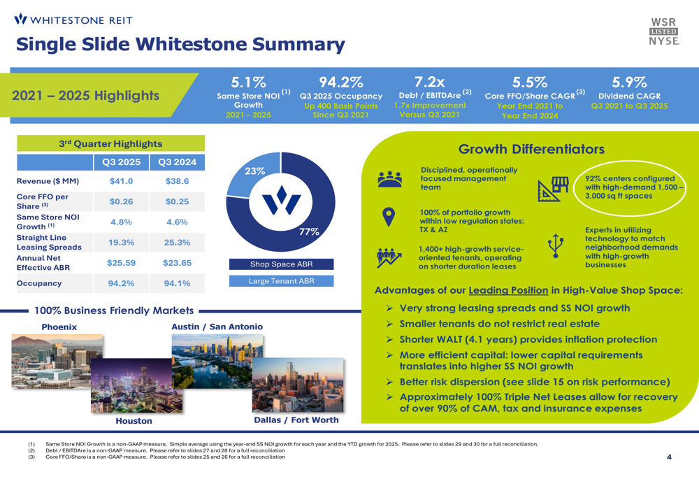 Whitestone's Q3 2025 results demonstrated solid growth across key metrics. Revenue increased to $41 million from $38.6 million in Q3 2024, while same-store NOI growth reached 4.8%, slightly outpacing the 4.6% reported in the same quarter last year.