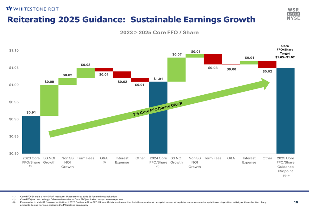 Whitestone reiterated its 2025 Core FFO per share guidance of $1.03-$1.07, representing continued growth from the 2023 base of $0.91 per share. The company expects to achieve this through a combination of same-store NOI growth, strategic acquisitions, and redevelopment initiatives.