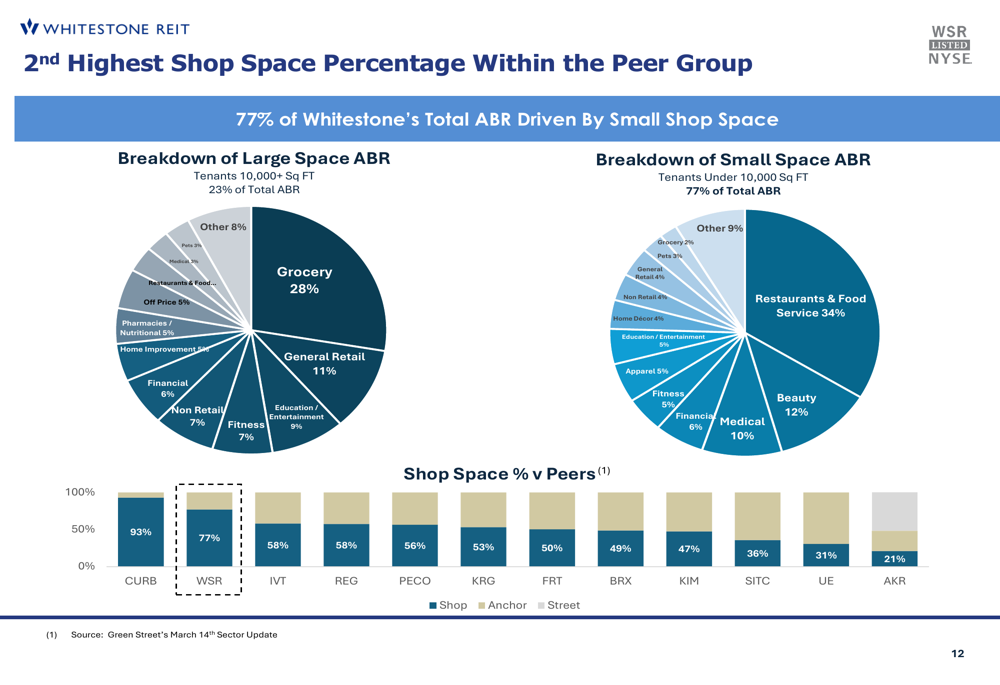 Whitestone positions itself as having the second-highest shop space percentage among its peer group at 77%, behind only CURB at 93%. This focus on smaller spaces is a key differentiator in the shopping center REIT sector.