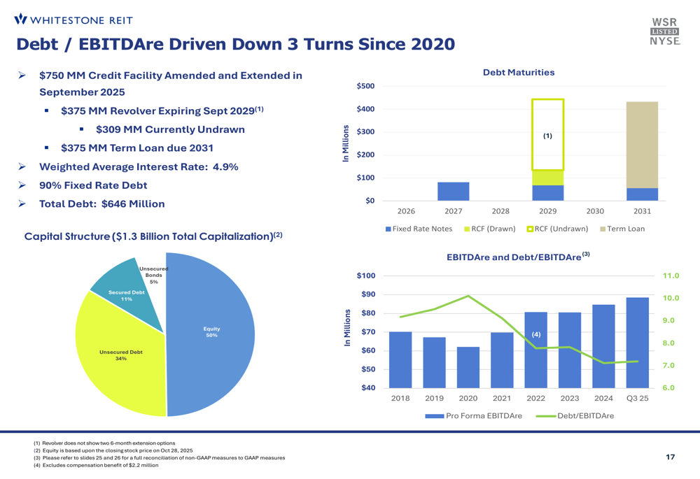 The company has also made significant progress in strengthening its balance sheet, reducing its Debt/EBITDAre ratio by approximately 3 turns since 2020. As of Q3 2025, Whitestone reports 90% fixed-rate debt with a weighted average interest rate of 4.9% and $309 million currently undrawn from its credit facility.