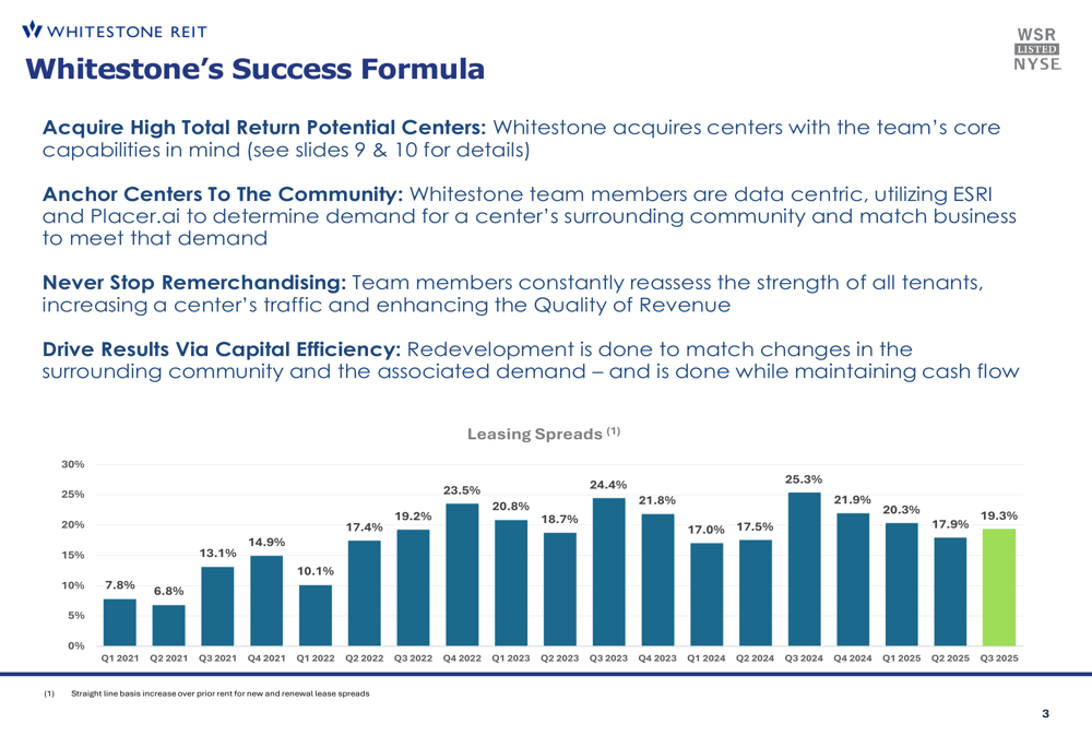 The company achieved leasing spreads of 19.3% in Q3 2025, continuing a pattern of double-digit spreads that has persisted since 2021. This performance reflects strong demand for Whitestone's retail spaces in its target markets.