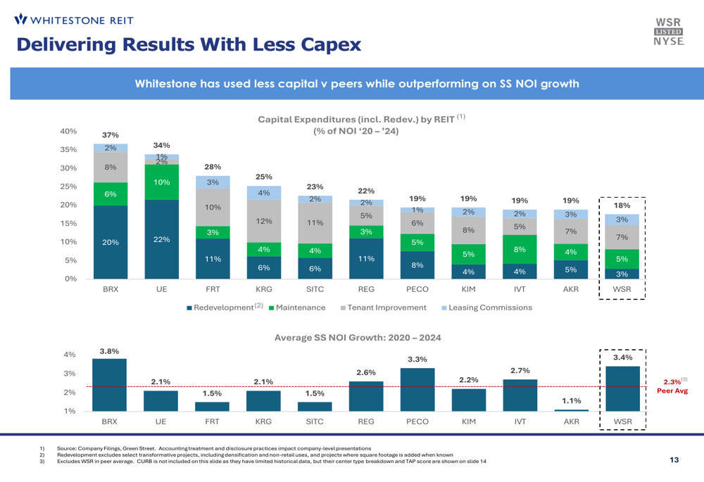 A notable competitive advantage highlighted in the presentation is Whitestone's capital efficiency. The company reports using less capital expenditure as a percentage of NOI compared to peers while delivering above-average same-store NOI growth of 3.4% from 2020-2024, compared to the peer average of 2.3%.