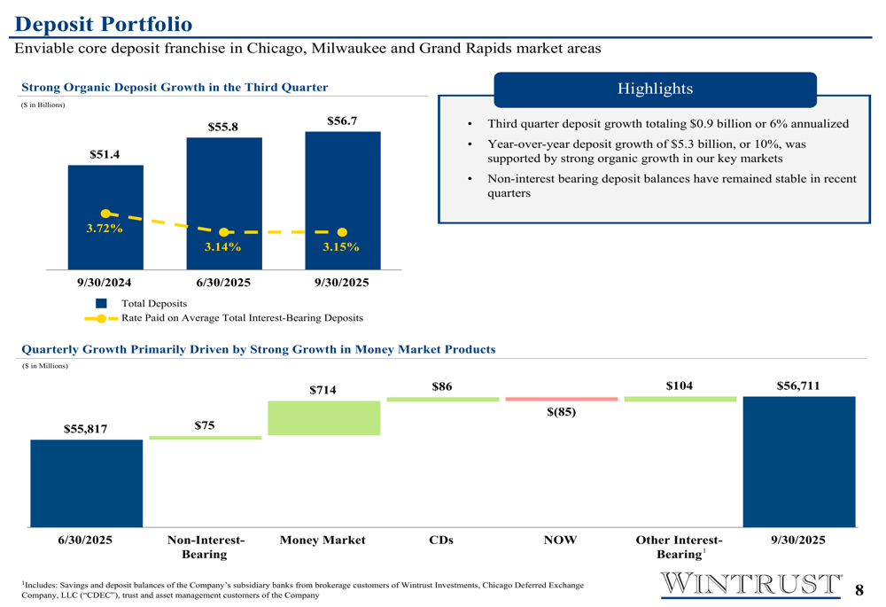 According to the company’s presentation slides, Wintrust achieved record quarterly net income of $216.3 million, up $20.7 million from the previous quarter. This performance was driven by robust loan and deposit growth, coupled with effective expense management and strong credit quality.