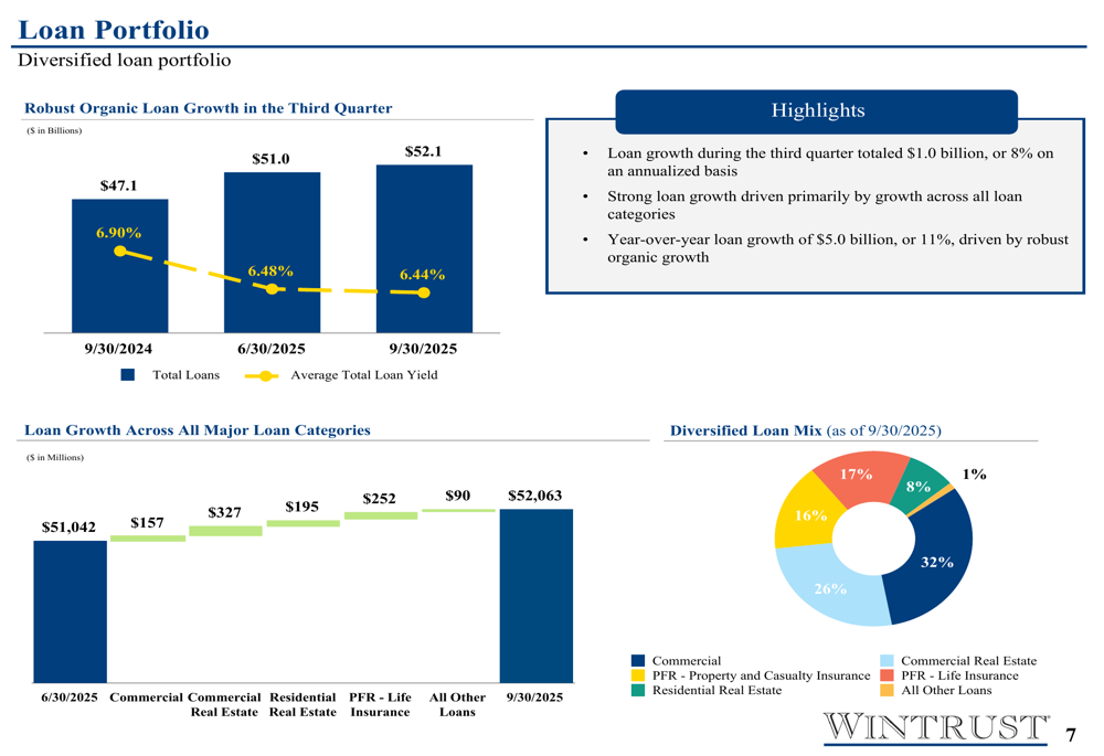 Wintrust reported strong loan growth across all major categories in Q3 2025. Total loans increased by $1.0 billion to $52.1 billion, representing an 8% annualized growth rate. Year-over-year, the loan portfolio expanded by $5.0 billion or 11%.
