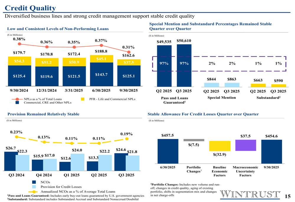 Wintrust maintained strong credit quality in Q3 2025, with non-performing loans decreasing to 0.31% of total loans, down from 0.37% in the previous quarter. This represents a historically low level for the company, as illustrated in the following chart:
