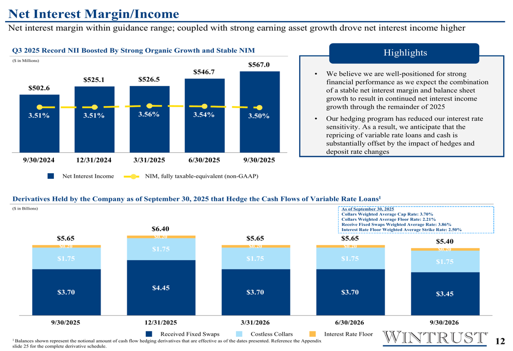 Wintrust’s Q3 2025 results showed significant improvement across key metrics. The company reported a return on assets of 1.26%, up 7 basis points from the previous quarter, while maintaining a stable net interest margin of 3.50%.