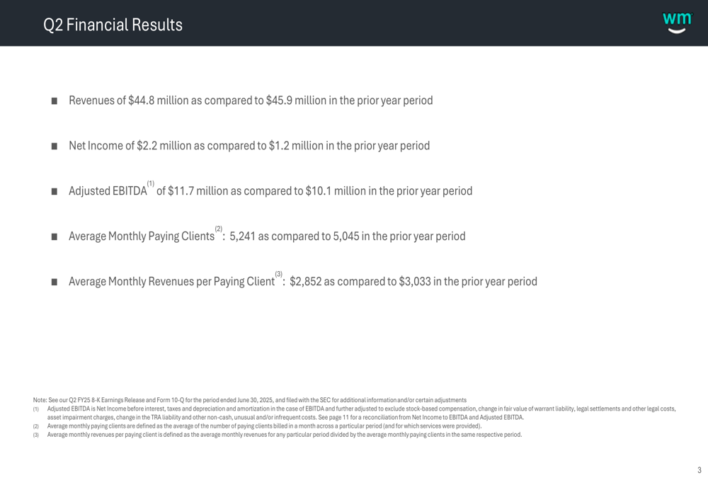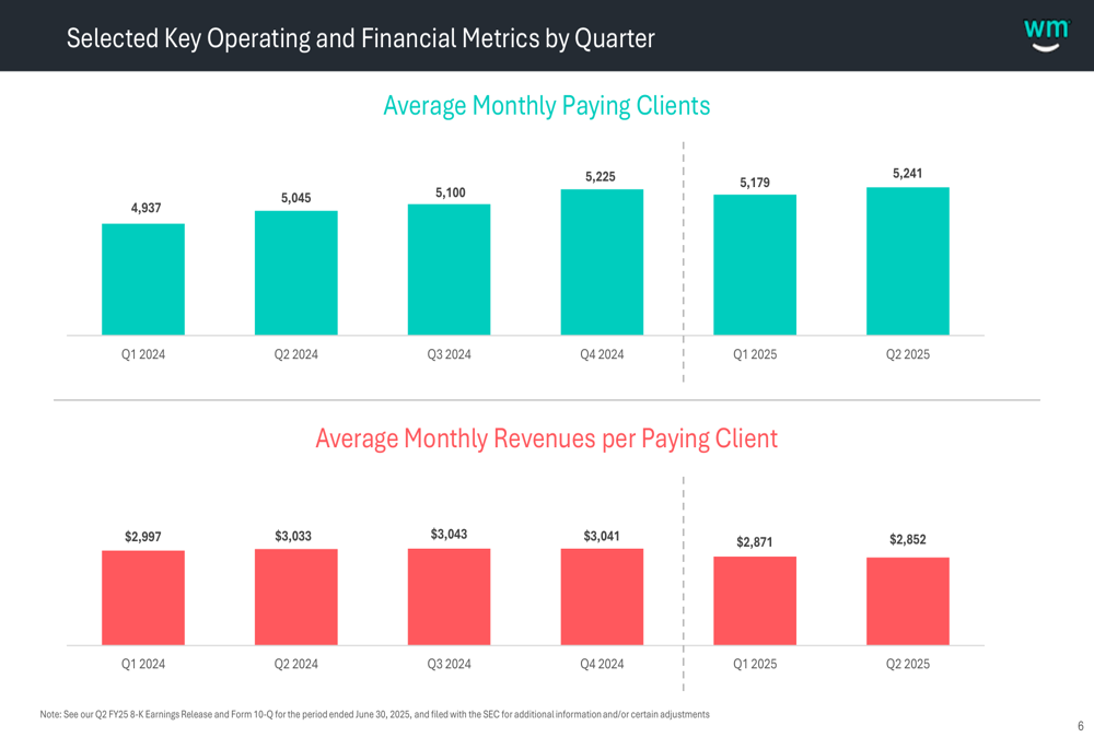 The company's client metrics present a mixed picture. Average monthly paying clients increased to 5,241 in Q2 2025, up from 5,045 in Q2 2024, representing a 4% year-over-year growth. However, average monthly revenue per paying client decreased to $2,852, down from $3,033 in the prior year period, indicating pricing pressures or changes in client composition.