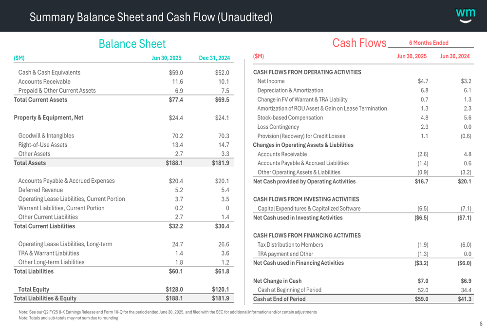WM Technology maintains a strong financial position with $59.0 million in cash and cash equivalents as of June 30, 2025, up from $52.0 million at the end of 2024. The company generated $16.7 million in operating cash flow during the first half of 2025, demonstrating solid cash conversion despite revenue challenges.