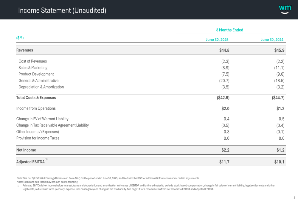 The detailed income statement reveals that WM Technology achieved these profitability gains through strategic cost reductions in sales and marketing (down 20% year-over-year) and product development (down 22% year-over-year):