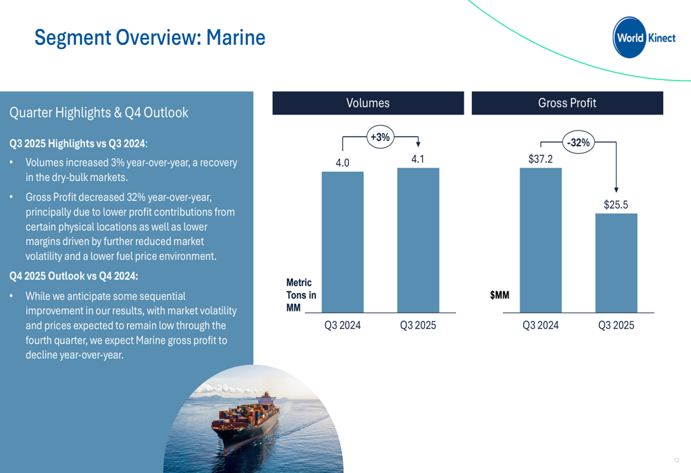 While Marine volumes increased 3% to 1,071 million gallons due to recovery in dry-bulk markets, gross profit plummeted 32% to $25.5 million. This significant drop was attributed to lower profit contributions and reduced market volatility. Management anticipates some sequential improvement in Q4 but still expects year-over-year gross profit decline due to continued low market volatility and prices.