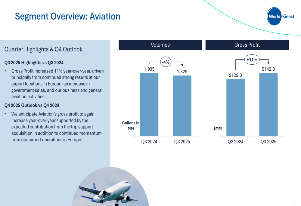 Despite a 4% decrease in volume to 1,829 million gallons, Aviation gross profit increased 11% to $142.8 million. This growth was attributed to strong results at European airport locations, increased government sales, and expansion in business and general aviation activities. Management expects continued year-over-year gross profit growth in Q4, supported by the recent trip support acquisition.