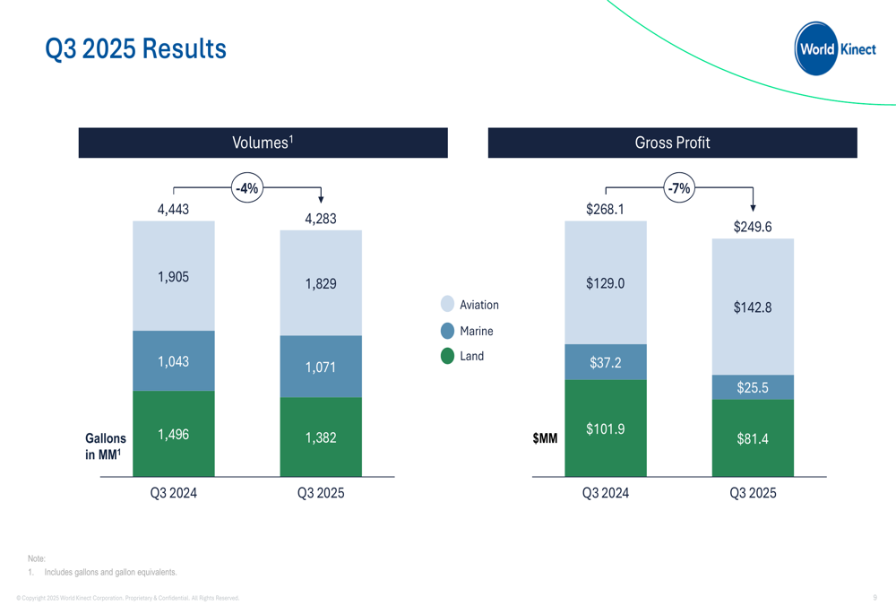 Land volumes decreased 8% to 1,382 million gallons, while gross profit fell 20% to $81.4 million. This decline was attributed to the recent sale of Brazil and UK Land businesses, unfavorable market conditions in North America, and strategic exits from certain North American land operations. The outlook for Q4 remains challenging, with management expecting continued year-over-year gross profit decline due to business exits and ongoing macroeconomic headwinds.