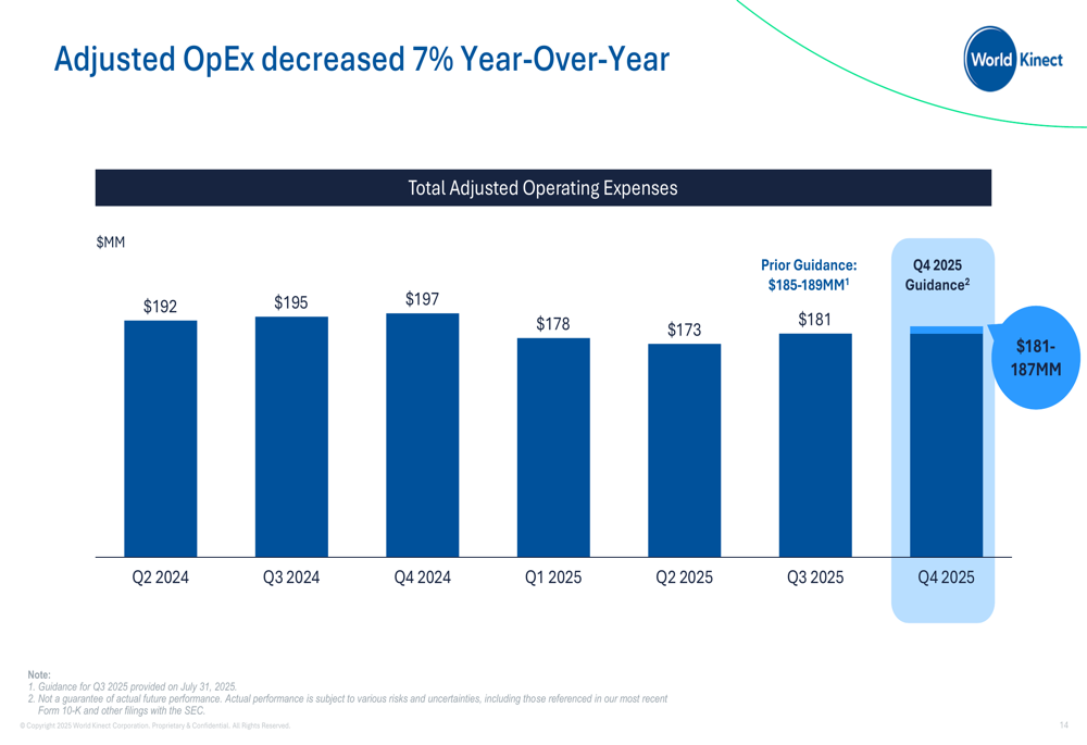 Adjusted operating expenses totaled $181 million in Q3 2025, down from $195 million in the same period last year. The Q4 guidance of $181-187 million represents an improvement from the previous guidance of $185-189 million, reflecting ongoing efficiency initiatives.