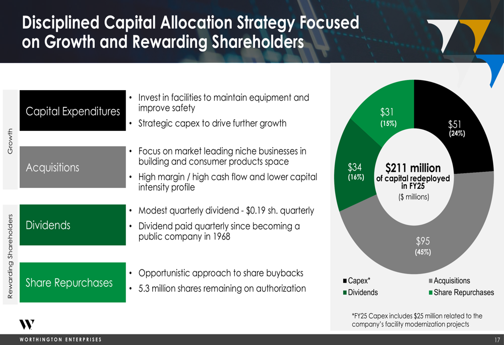 The company’s capital allocation priorities are clearly defined, with investments in growth (both organic and through acquisitions) balanced with shareholder returns through dividends and opportunistic share repurchases. In FY2025, Worthington deployed $211 million of capital across these priorities.