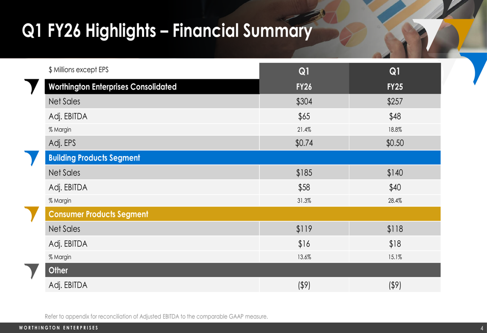 On the bottom line, Worthington reported net earnings of $35 million or $0.70 per diluted share, compared to $24 million or $0.48 per diluted share in Q1 FY2025. Adjusted earnings per share increased 48% to $0.74 from $0.50 in the prior year period.