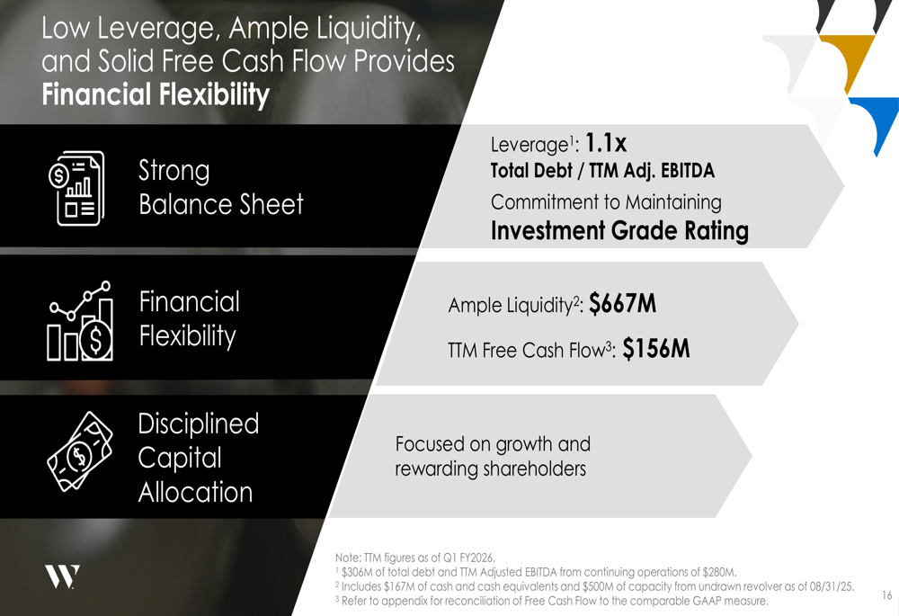 Worthington highlighted its strong financial position, with low leverage (1.1x total debt to TTM adjusted EBITDA), ample liquidity of $667 million, and trailing twelve-month free cash flow of $156 million. This financial flexibility supports the company’s balanced capital allocation strategy.