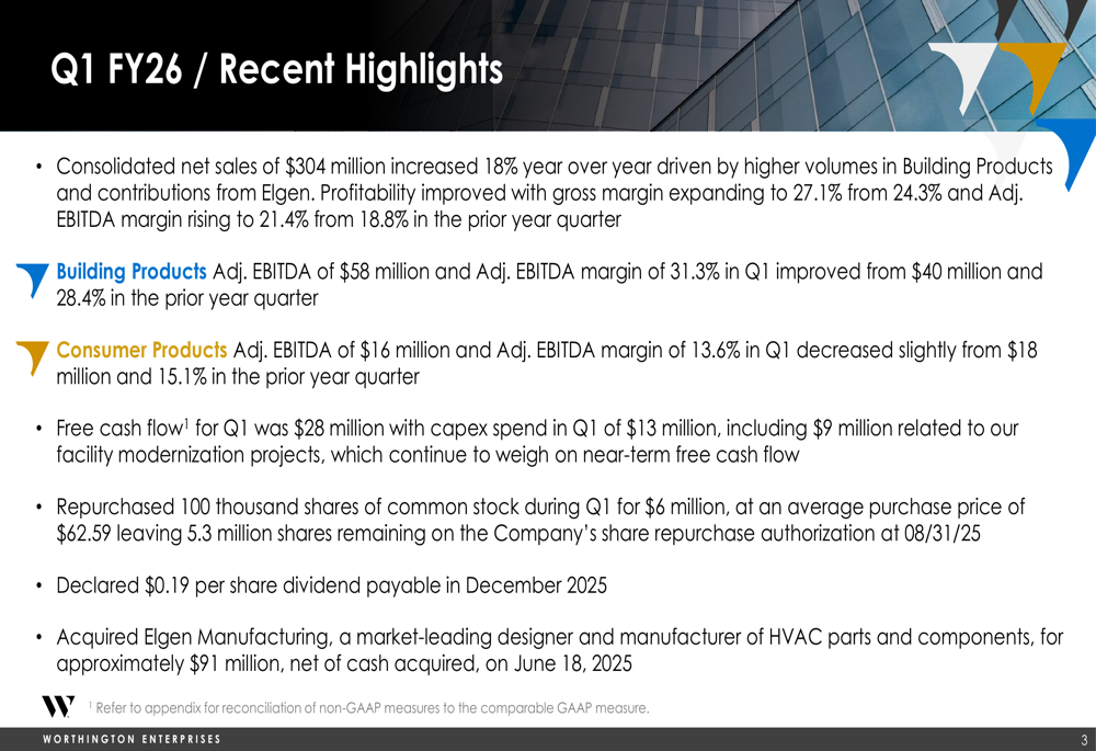 Worthington reported consolidated net sales of $304 million for Q1 FY2026, an 18% increase from $257 million in the prior year period. This growth was accompanied by improved profitability, with gross margin expanding to 27.1% from 24.3% and adjusted EBITDA margin rising to 21.4% from 18.8% year-over-year.