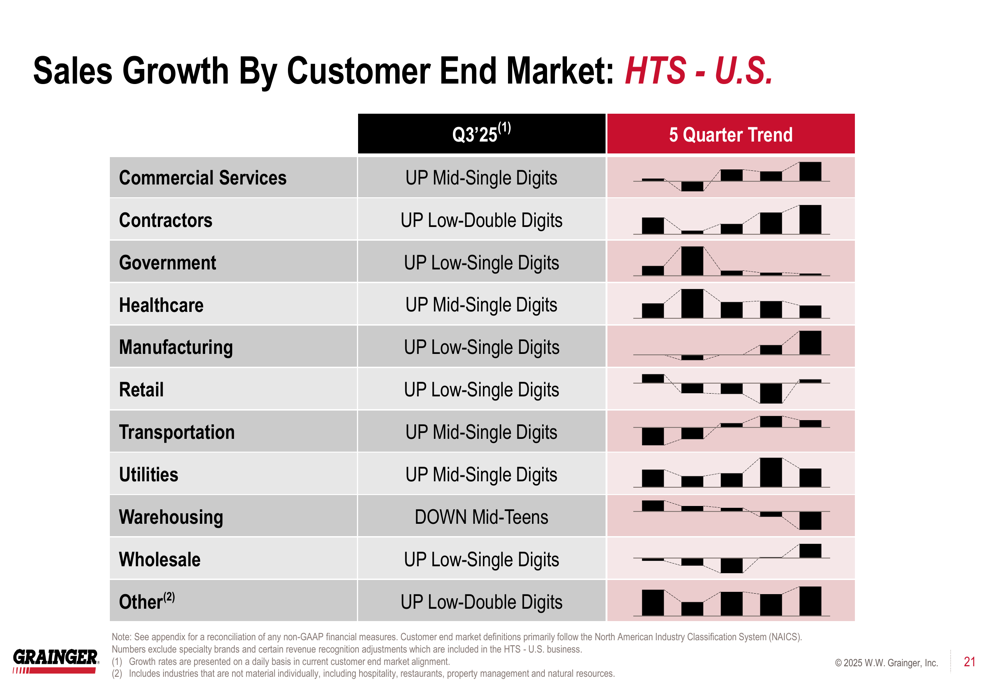 The company's customer end market performance in the High-Touch Solutions U.S. segment showed varied results, with particularly strong growth in the Contractors segment (up low-double digits) and Commercial Services (up mid-single digits). However, the Warehousing segment experienced a significant decline in the mid-teens.