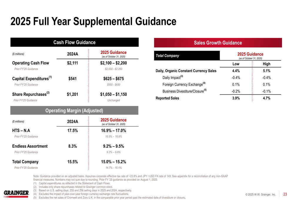 Grainger expects to generate operating cash flow between $2.1 billion and $2.2 billion for the full year, with capital expenditures ranging from $625 million to $675 million. The company plans to return $1.05 billion to $1.15 billion to shareholders through share repurchases, demonstrating its commitment to shareholder returns despite ongoing investments in growth.