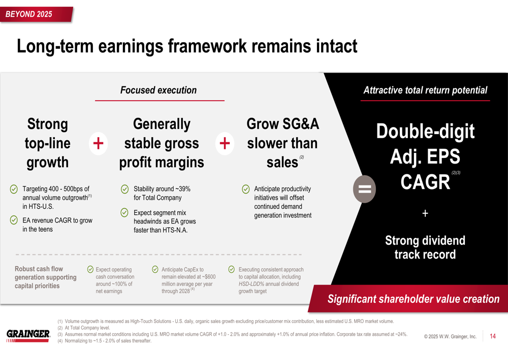 Looking beyond 2025, Grainger maintains its long-term earnings framework, which targets double-digit adjusted EPS compound annual growth rate. The company anticipates capital expenditures to remain elevated at approximately $600 million per year through 2028 as it continues to invest in growth initiatives.
